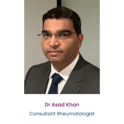 Dr Asad Khan, Consultant Rheumatologist sees and treats patients privately at MUMS. Dr Khan sees NHS patients at Solihull Hospital and is hugely experienced in the diagnosis and treatment of rheumatological conditions. He qualified from Barts and the London School of Medicine and Dentistry in 2005, trained in London and the East of England, and took up his position as an NHS consultant in 2015.