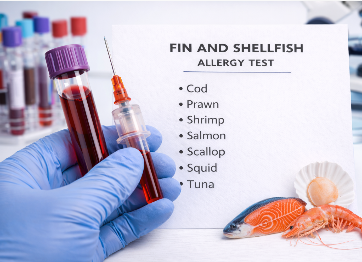 A fin and shellfish allergy blood test (usually measuring specific IgE antibodies) is done to check whether someone has an immune reaction to fish (finfish) and/or shellfish such as prawns, crab, lobster, mussels, or scallops.
