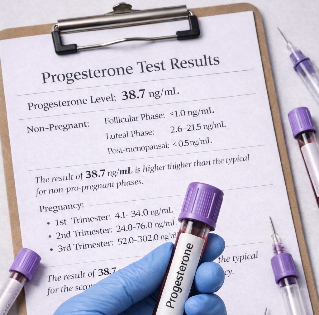 It is a test to measure progesterone levels in the blood. The ovaries make Progesterone which is a hormone. In pregnancy – progesterone is particularly important. A woman’s cycle has very different progesterone levels, dependent upon the time of the month. At the beginning of the month, progesterone levels are low and begin to increase once an egg is released by the ovaries. Pregnant women’s progesterone levels rise continually. If an egg is not fertilised the progesterone levels decrease, and a menstrual period begins.